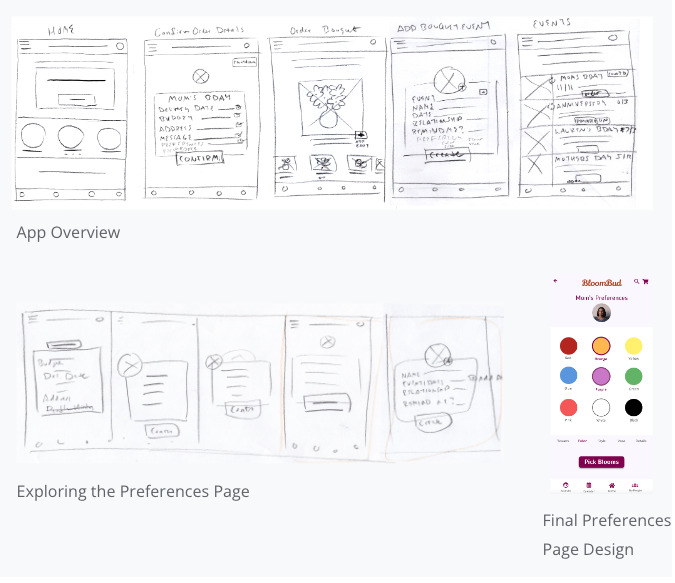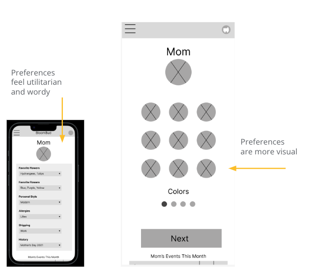 The confusion from the research participants revealed that I was trying to design too many features at once. I focused on the preferences page, as research proved this was the most unique and useful element of the app. I did like the large image on the bouquet selection page and began wondering how I could make the app overall more visual and fun to use.