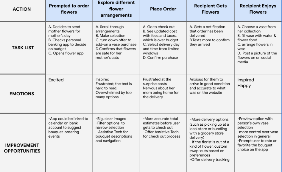 Mapping Diane’s user journey revealed how time consuming and frustrating placing a bouquet order can be. It would be helpful to have features like custom filters, save-able preferences, event reminders and delivery tracking.