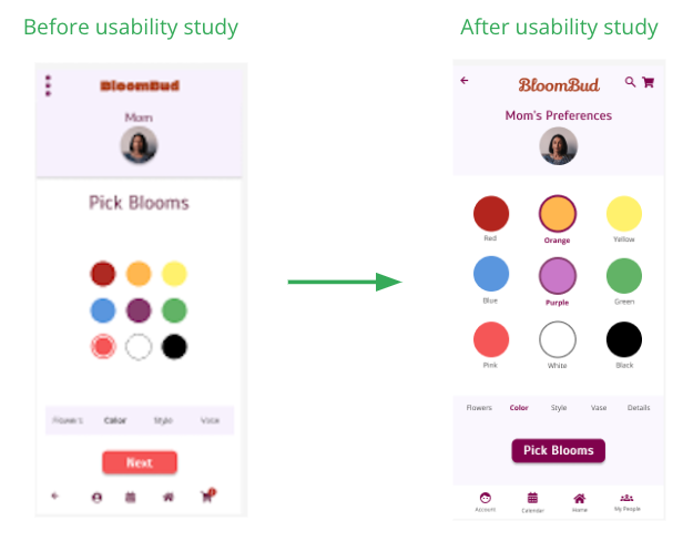 Users were confused about the function of the Preferences page and spent a long time reading the options. They seemed surprised when the bouquet was picked from this page. Updating the page to a series of pages with large images made this part of the app more enjoyable for users, and they felt like they were “building” the bouquet.